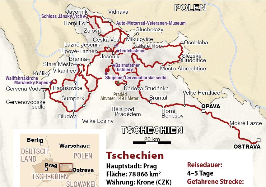 56 Gipfel über 1000 Meter zählt das Altvatergebirge, eine ganz schön unbekannte, zu genussvollem Kurven und, später vielleicht, heilsamen Kuren einladende Region im Nordosten von Tschechien.