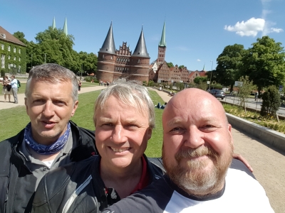 In Büchen gab es einen Spaghettibecher für alle drei. Gegen 14.30 Uhr waren wir in Lübeck. Selbstverständlich besuchten wir das Echte Holstentor. Am Holstentor wartete mein alter Studienkollege Stefan auf uns. Der war sehr traurig. Er hatte auf dem Weg nach Lübeck kurz vor Bad Oldeslohe seine S1000RR im Kreisel auf die Seite gelegt. Der neue Hinterradreifen war noch nicht eingefahren und hatte keinen Grip. Gott sei Dank nur Sachschaden, aber trotzdem sehr ärgerlich.